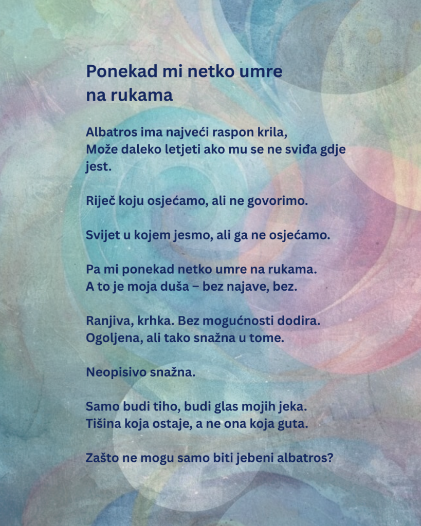 Poezija naših studenata želi dobrodošlicu još jednoj pjesnikinji! Ona se zove Gabrijela Brezović i danas objavljujemo njezinu pjesmu naslovljenu Ponekad mi netko umre na rukama. Nadamo se da ćete s užitkom čitati stihove i želimo vam još jedan lijep i ugodan četvrtak.